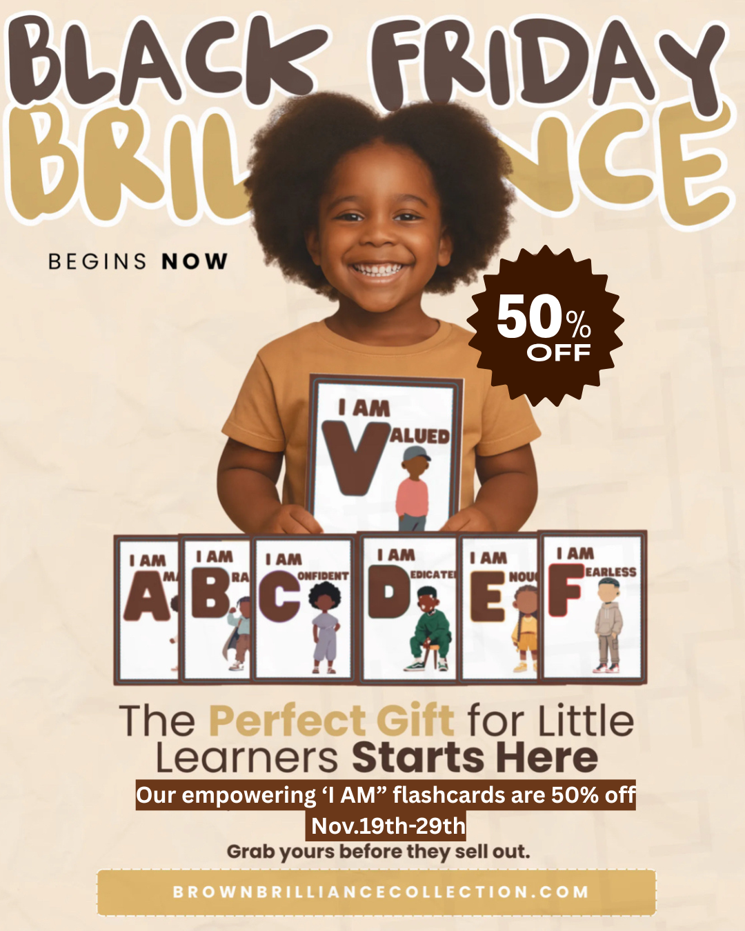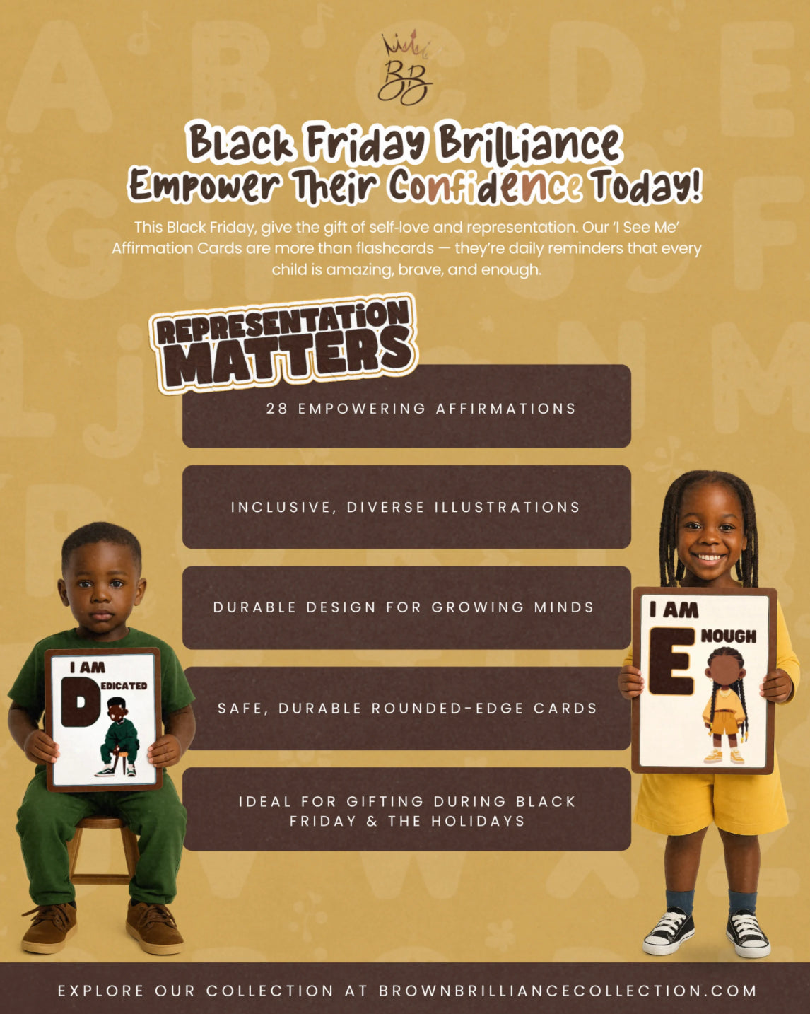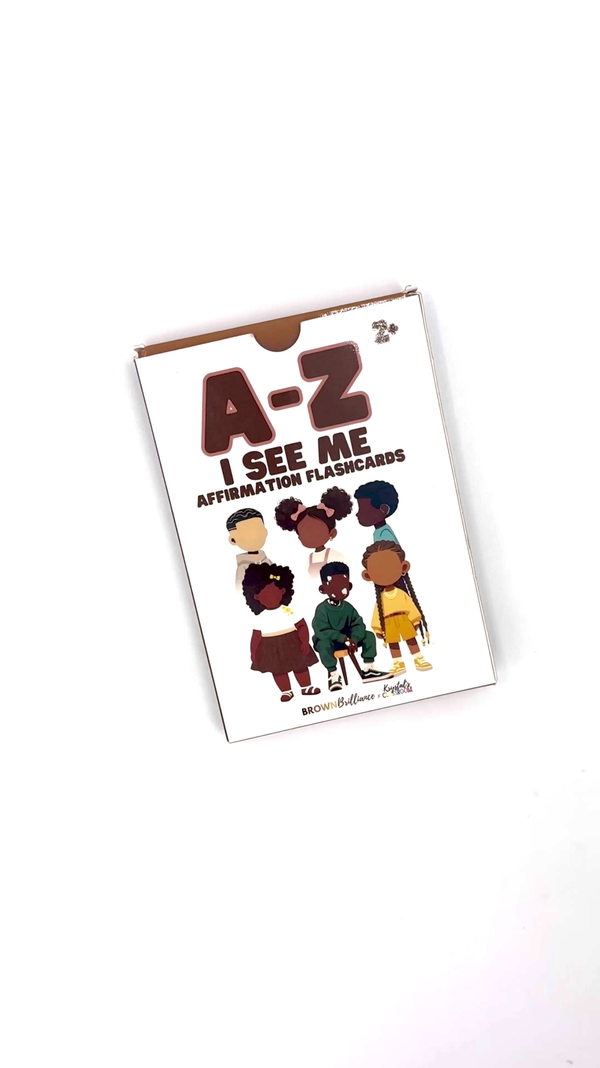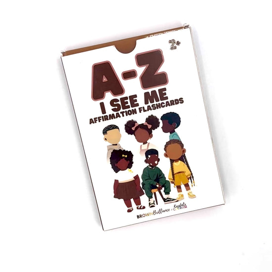 Our A-Z I See Me Affirmation Flashcards, were specifically created for Black children to see themselves while learning to affirm their uniqueness and potential on an empowering journey through the alphabet.